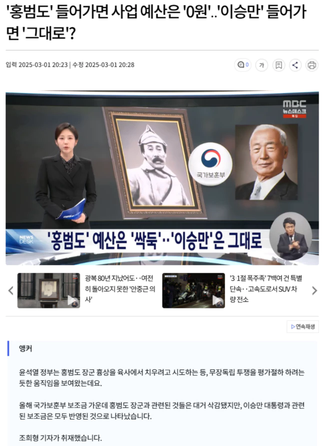 '홍범도' 예산은 '싹둑'.. '이승만'은 그대로
