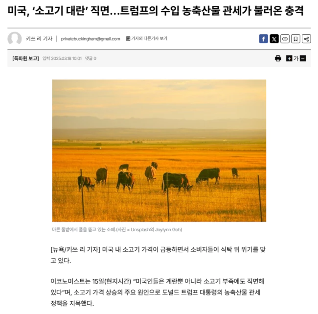 이코노미스트는 “관세 부과로 소고기 가격이 급등하면, 축산업자들이 단기적으로는 더 많은 소를 도축해 판매하려 들 것이지만, 장기적으로는 미국 내 소 사육 규모를 줄이는 결과를 초래할 수 있다”고 경고했다.