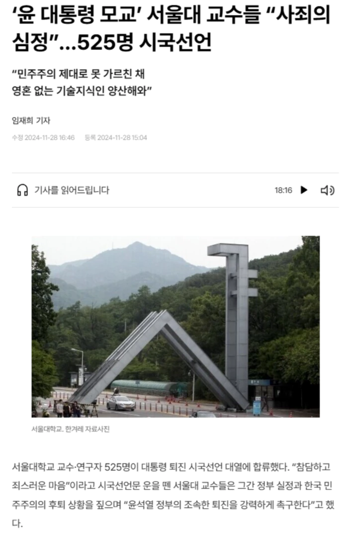 윤 대통령의 모교이기도 한 서울대 교수·연구자들은 시국선언문에서 “서울대가 교육과 연구에서 제대로 인권과 민주주의의 가치를 가르치지 못한 채 ‘영혼이 없는 기술지식인’을 양산해 온 것은 아닌지 참담하고 죄스러운 마음”이라고 했다. 이어 이태원 참사와 채상병 사건, 의료 대란, 대북 관계, 외교 난맥상 등을 두루 짚으며 “상식적으로 이해할 수 없는 일들이 너무 많았고, 이제는 그것이 일상다반사처럼 되어 국민이 더이상 참기 힘든 상태가 되었다”고 짚었다.