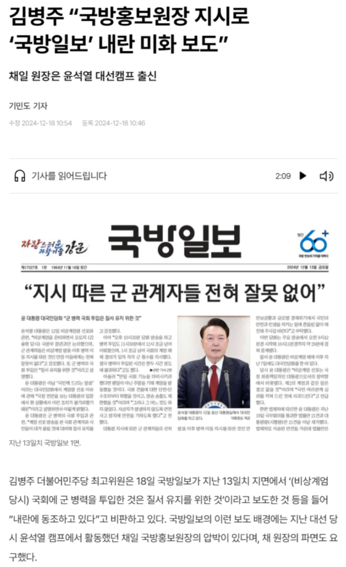 김 최고위원은 이날 국회에서 열린 최고위원회의에서 “(국방일보는) 비상계엄은 ‘고도의 정치적 판단’이자 ‘통치행위’라는 내용 일색”이라며 이렇게 말했다. 국방일보는 국방부 산하 국방홍보원이 발행하는 군 일간지다.