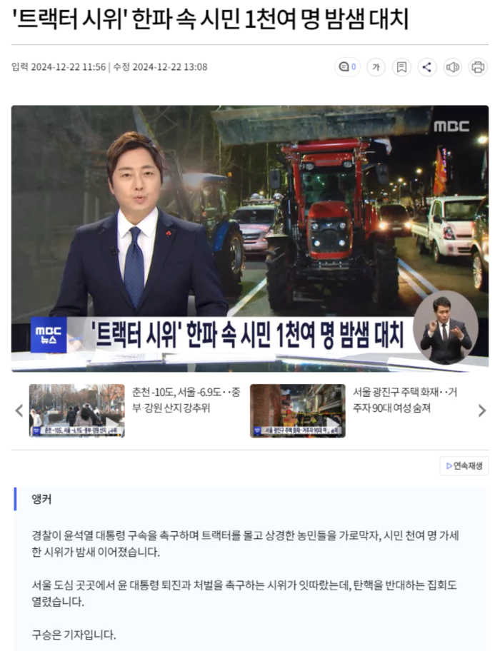 '트랙터 시위' 한파 속 시민 1천여 명 밤샘 대치