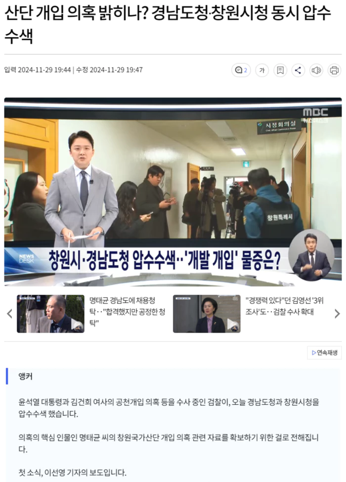 창원시가 관련 서류를 경상남도에 보내면 도가 검토한 뒤 국토부로 보내는 구조라 두 기관을 동시에 압수수색한 것으로 보입니다.