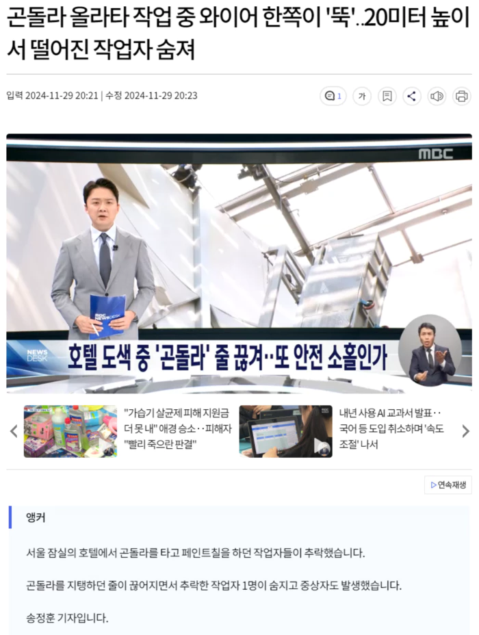 곤돌라 올라타 작업 중 와이어 한쪽이 '뚝'.. 20미터 높이서 떨어진 작업자 숨져