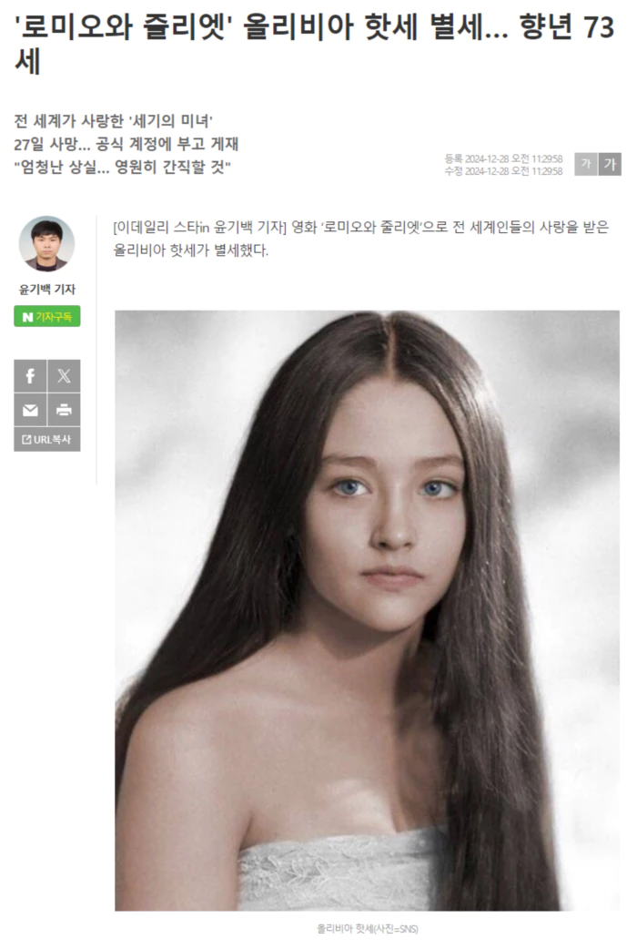 '로미오와 줄리엣' 올리비아 핫세 별세.. 향년 73세