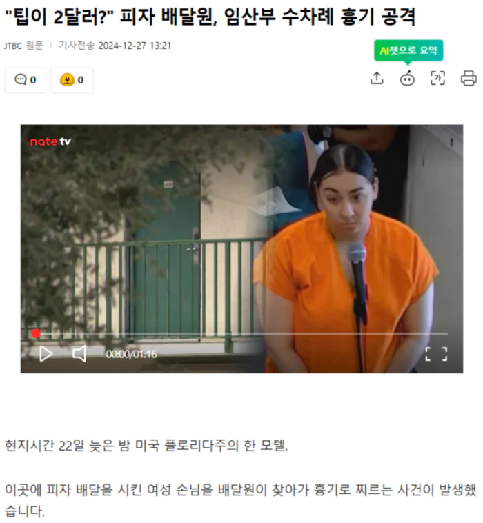 "팁이 2달러?" 피자 배달원, 임산부 수차례 흉기 공격 : 네이트 뉴스