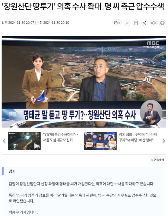 '창원산단 땅투기' 의혹 수사 확대.. 명 씨 측근 압수수색