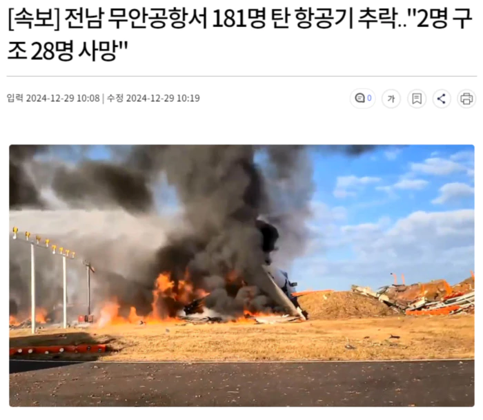 전남 무안공항서 181명 탄 항공기 추락.. "2명 구조 28명 사망"