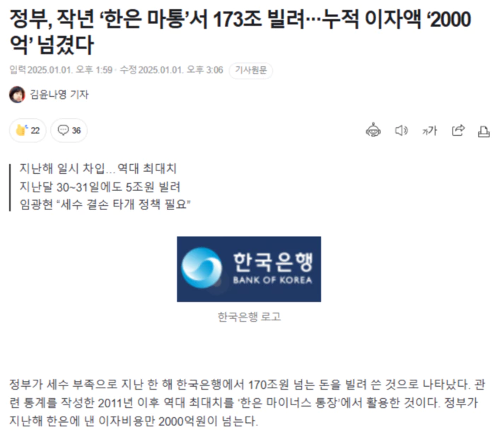 정부, 작년 ‘한은 마통’서 173조 빌려.. 누적 이자액 ‘2000억’ 넘겼다