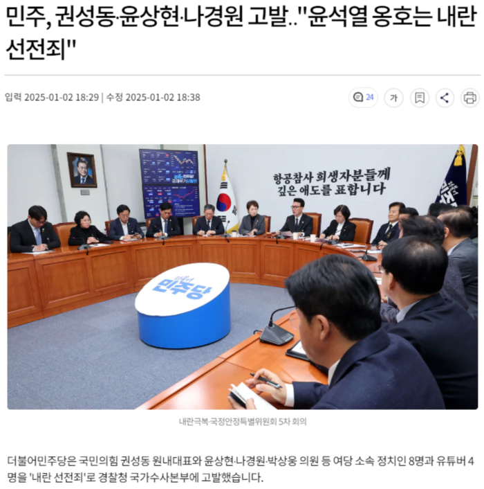 민주당 내란극복·국정안정 특별위원회는 오늘 오후 국회 소통관 기자회견에서 "내란 행위와 내란 우두머리 윤석열 대통령을 옹호하는 행위는 형법 제90조 2항에 따른 내란 선전죄에 해당한다"며 이같이 밝혔습니다.