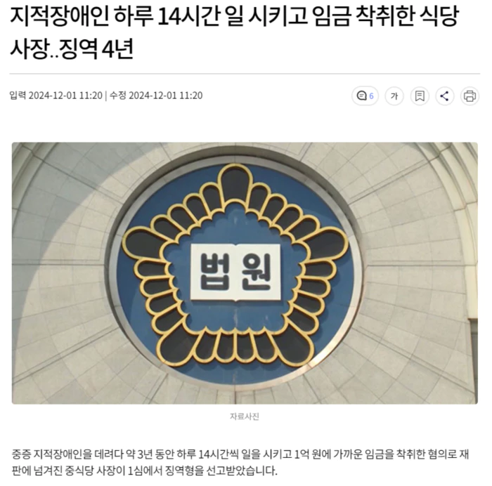 지적장애인 하루 14시간 일 시키고 임금 착취한 식당 사장.. 징역 4년