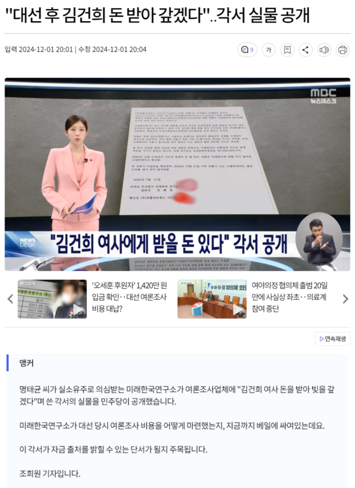 "미래한국은 당시 윤석열 대통령 후보의 부인 김건희 여사에게 돈을 받을 게 있으며, 대선 중이라서 받는 게 어려우니 대선 이후 김 여사에게 돈을 받아 미수금을 모두 변제하겠다고 약속한다"고 적혀있습니다.