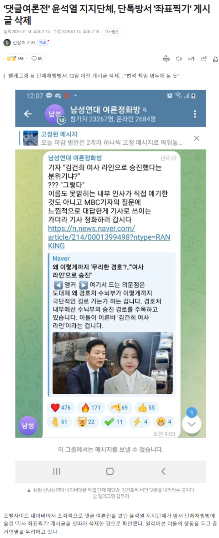 14일 <오마이뉴스> 취재 결과, 윤석열 지지단체인 신남성연대는 텔레그램과 디스코드 단체 채팅방에 게시됐던 '기사 좌표 찍기' 게시글 수십여 건을 삭제했다. 당초 이 채팅방에는 윤석열 비판 기사 등에 대한 링크 공유와 함께 "좌빨댓글 내리기, 정상 댓글 올리기" 등 댓글작업을 독려했던 공지들이 있었는데, 대거 삭제된 것이다. 현재 신남성연대 텔레그램과 디스코드 단체 채팅방에는 13일 이후 게시글만 일부 확인할 수 있는 상태이며, 정확한 삭제 시점은 확인되지 않고 있다.