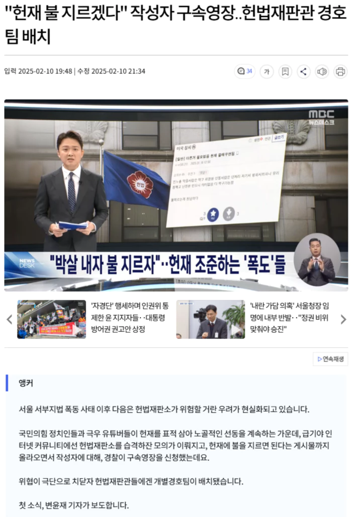 헌재 불 지르겠다, 작성자 구속영장.. 헌법재판관 경호팀 배치