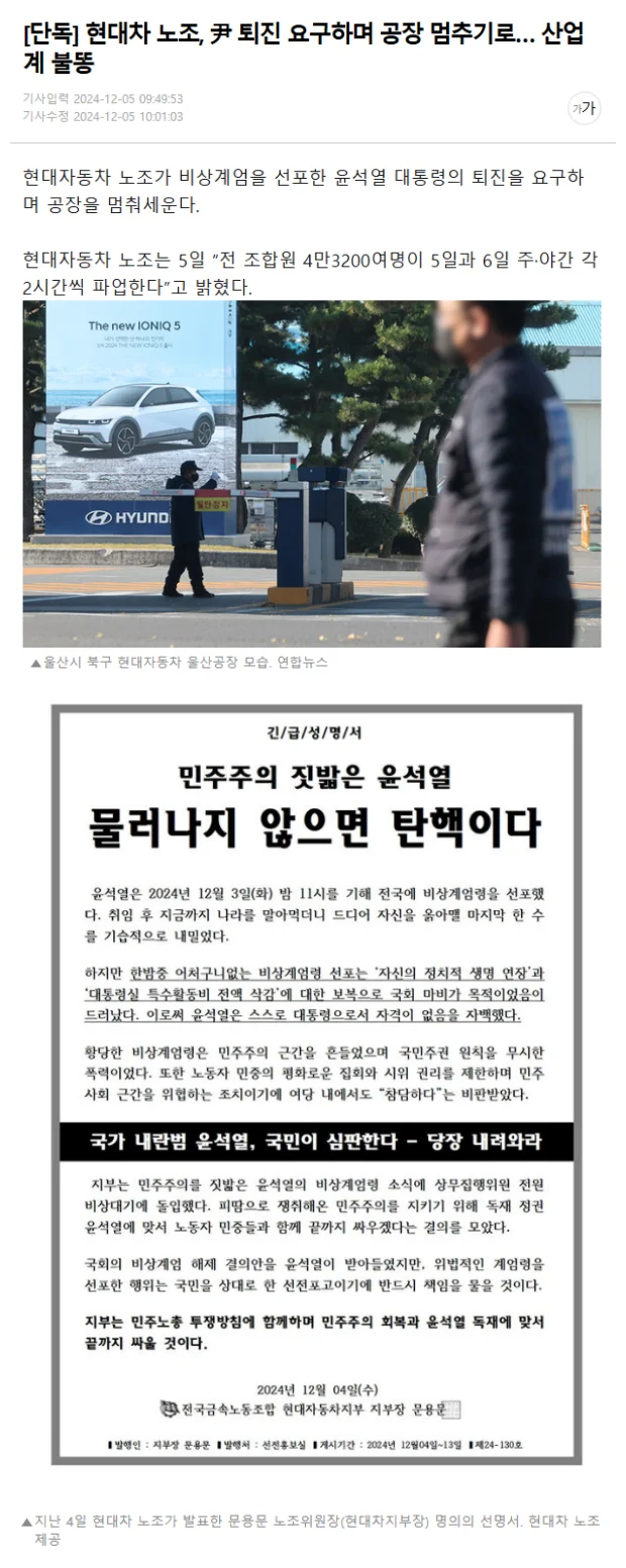 현대차 노조, 尹 퇴진 요구하며 공장 멈추기로.. 산업계 불똥