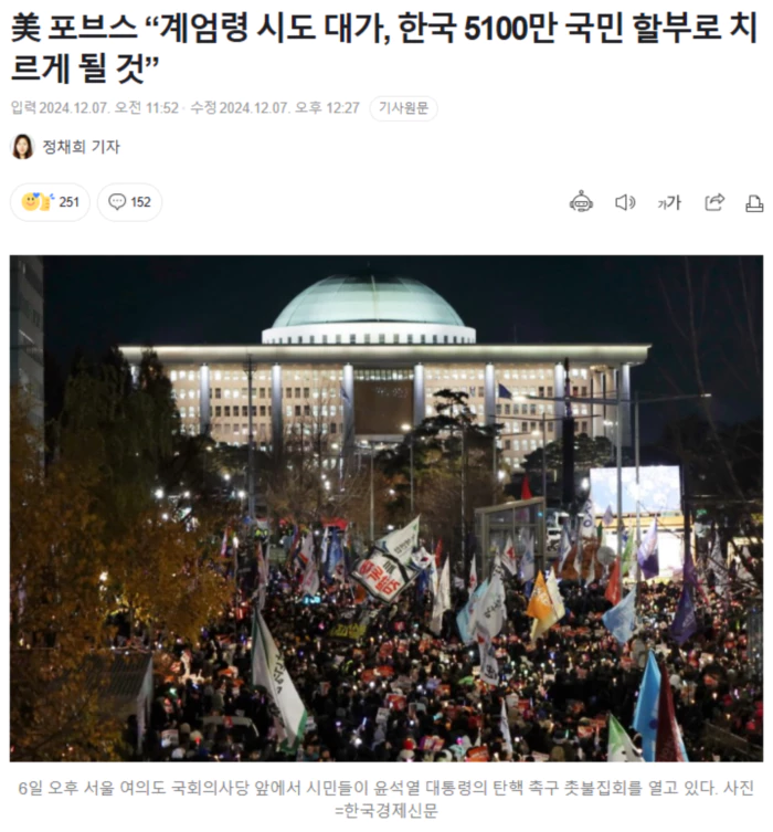 美 포브스 “계엄령 시도 대가, 한국 5100만 국민 할부로 치르게 될 것”