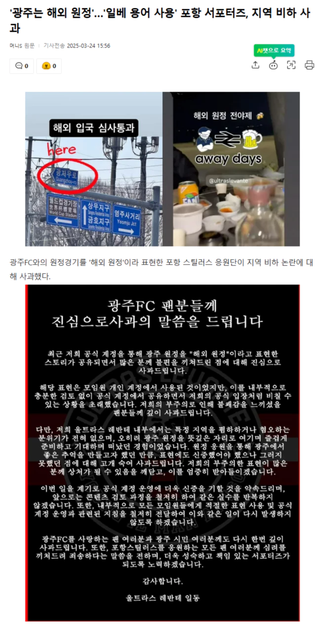 포항 응원단 중 한 모임인 울트라스 레반테는 24일 인스타그램을 통해 지역 비하 논란에 대해 사과했다. 울트라스 레반테는 "광주 원정을 '해외 원정'이라고 표현한 스토리가 공유되면서 많은 분께 불편을 끼쳐드린 점에 대해 진심으로 사과드린다"며 "해당 표현은 모임원 개인 계정에서 사용된 것이지만 이를 내부적 검토 없이 공식 계정으로 공유했다"고 사과했다.
