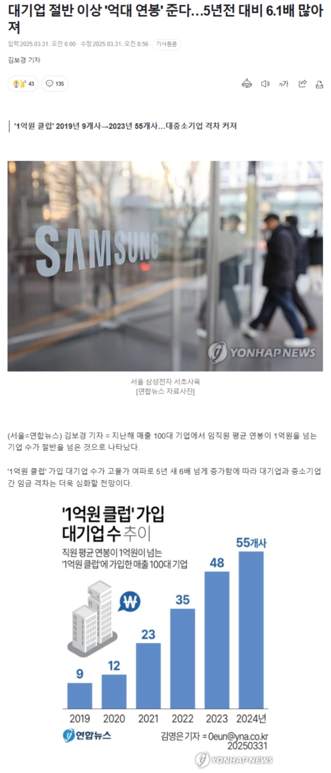 임직원 평균 연봉이 1억원이 넘는 '1억원 클럽'에 가입한 매출 100대 기업은 2019년 9개사, 2020년 12개사, 2021년 23개사, 2022년 35개사, 2023년 48개사, 지난해 55개사로 매년 늘고 있다.