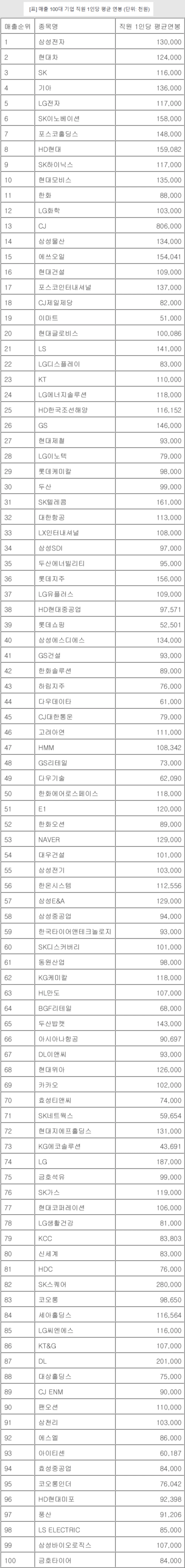 삼성전자가 1억3천만원의 임직원 평균 연봉을 기록했고, 현대차 1억2천400만원, ㈜SK 1억1천600만원, 기아 1억3천600만원, LG전자 1억1천700만원이었다.