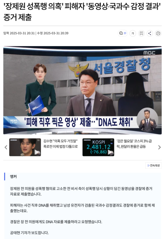 경찰은 성폭력 혐의로 고소된 지 두 달여 만인 지난 28일 장 전 의원을 비공개로 조사하면서 DNA를 임의제출하라고 요청했습니다.