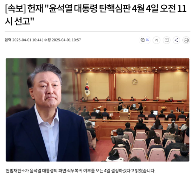 헌재는 오늘 "대통령 윤석열 탄핵 사건에 대한 선고가 4월 4일 오전 11시 대심판정에서 있을 예정"이라고 밝혔습니다.