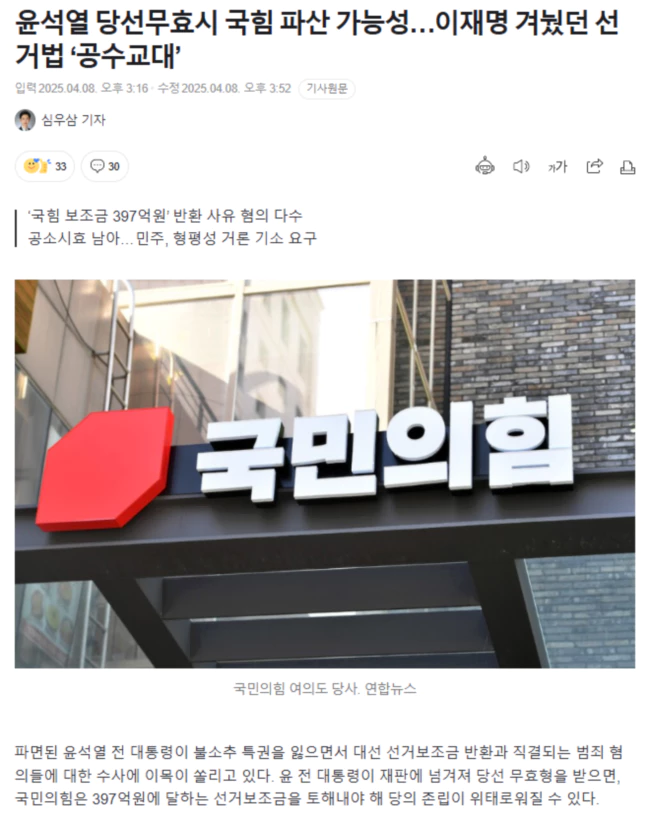 윤석열 당선무효시 국힘 파산 가능성.. 이재명 겨눴던 선거법 ‘공수교대’