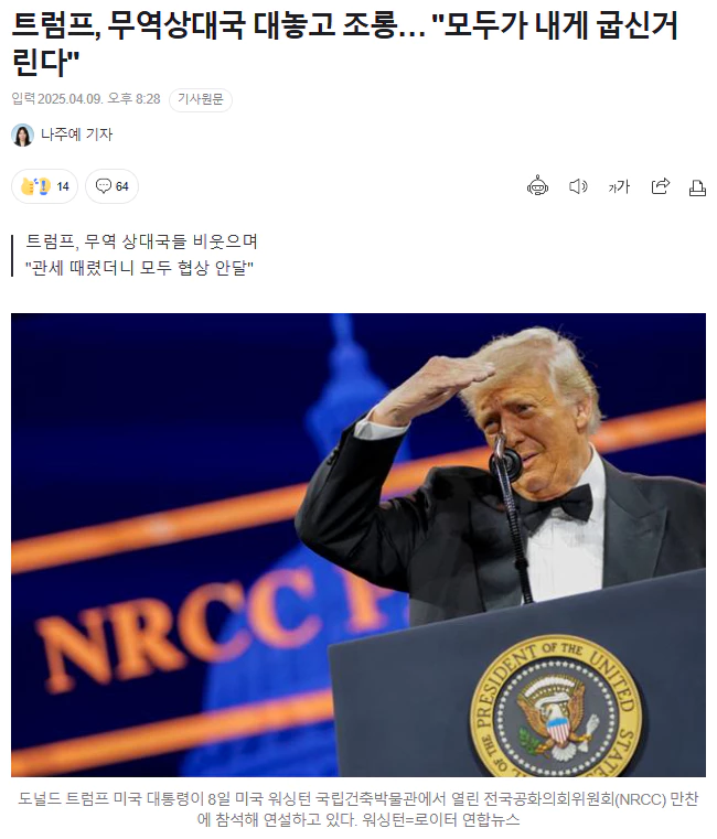 트럼프, 무역상대국 대놓고 조롱.. "모두가 내게 굽신거린다"