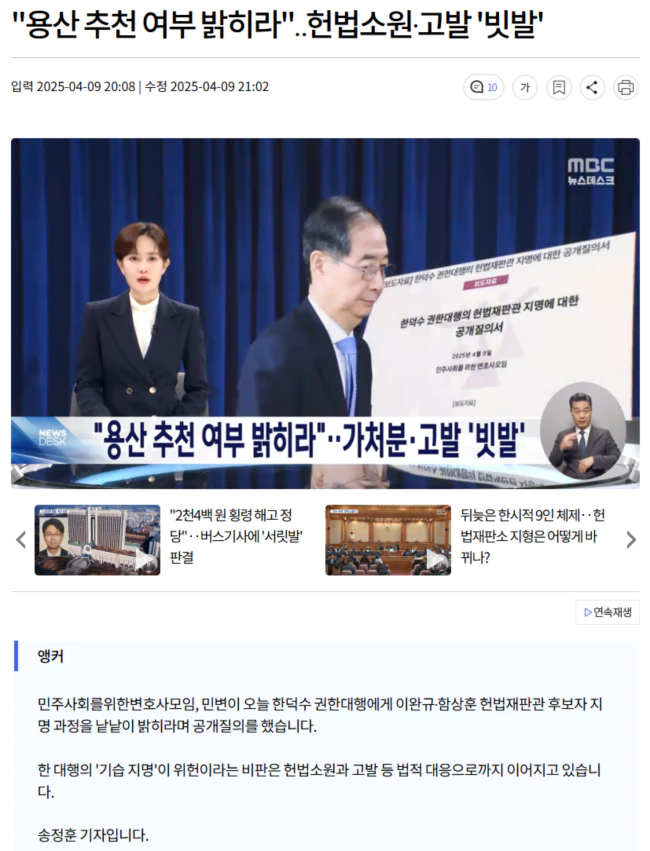 민변이 한덕수 대통령 권한대행에게 보낸 공개질의서를 통해 헌법재판관 지명 관련 의혹을 해명하라고 촉구했습니다.