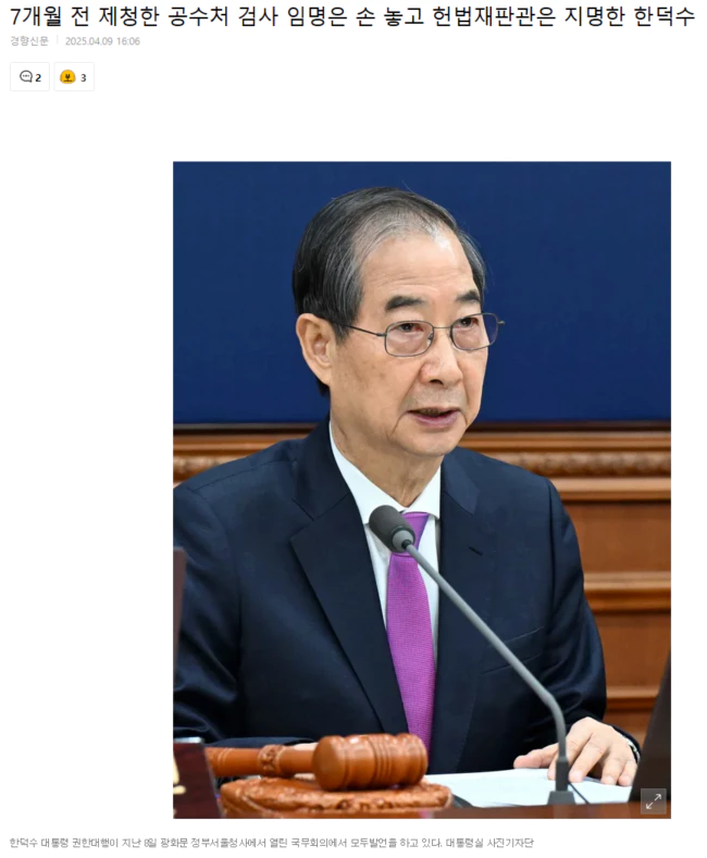 7개월 전 제청한 공수처 검사 임명은 손 놓고 헌법재판관은 지명한 한덕수