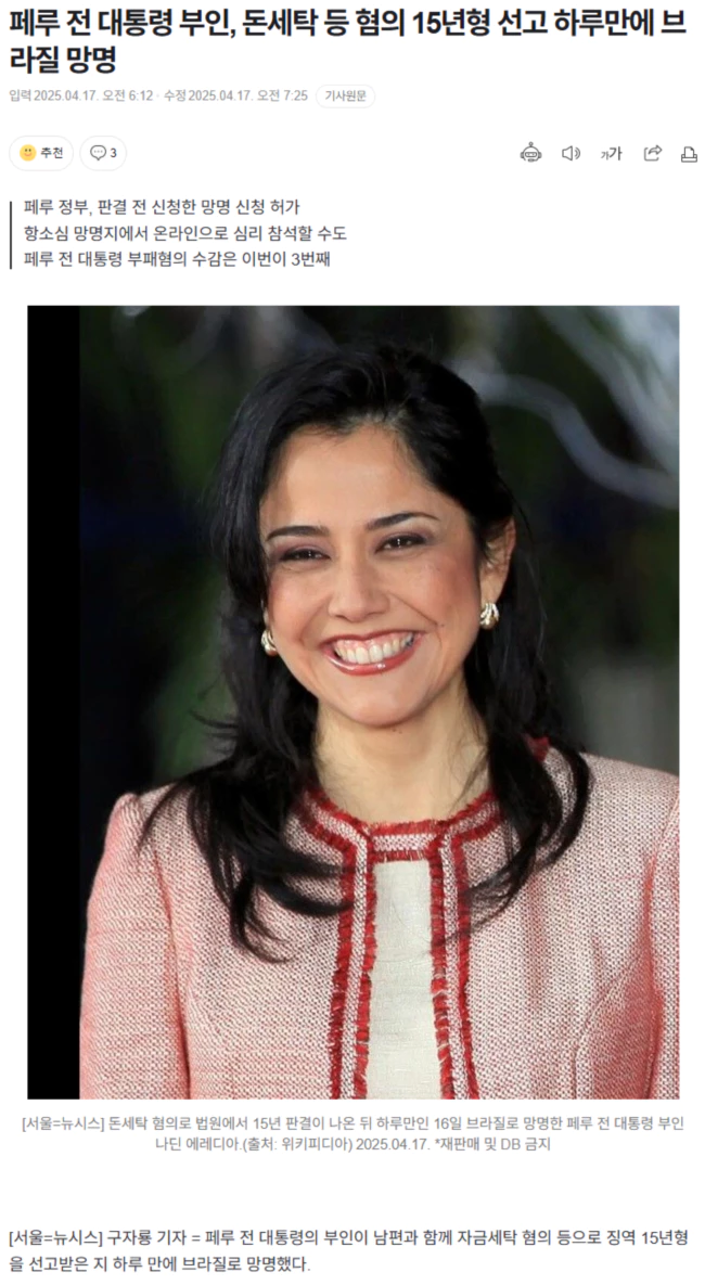 페루 전 대통령 부인, 돈세탁 등 혐의 15년형 선고 하루만에 브라질 망명