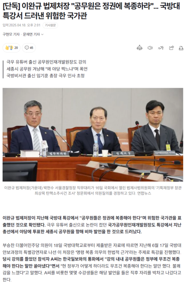 이완규 법제처장 "공무원은 정권에 복종하라".. 국방대 특강서 드러낸 위험한 국가관