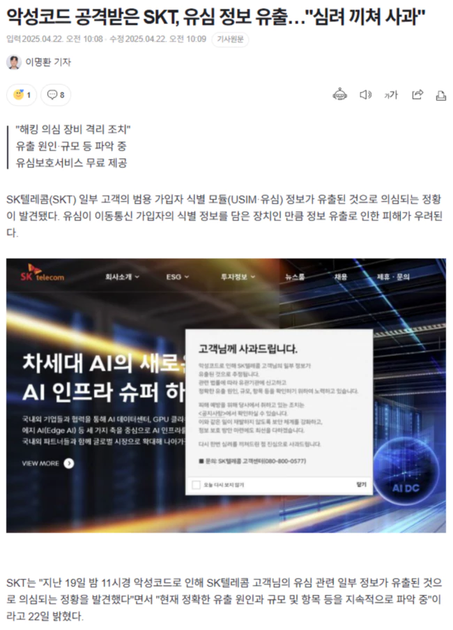 악성코드 공격받은 SKT, 유심 정보 유출.. "심려 끼쳐 사과"