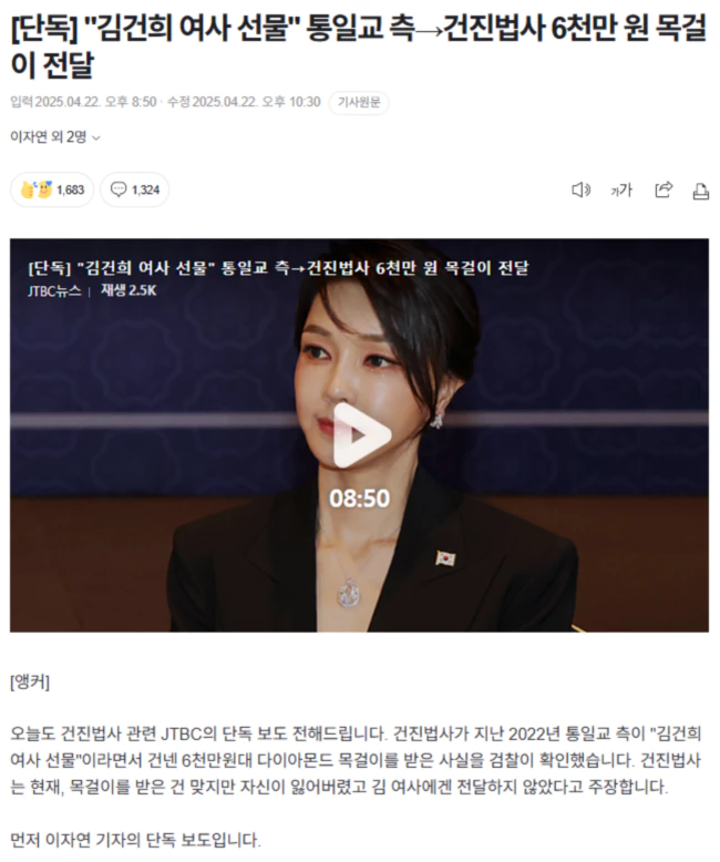 통일교 측이 "김건희 여사 선물"이라며 건넨 6천만원대 다이아몬드 목걸이, 의혹의 핵심은 건진법사가 이걸 받은 뒤 김 여사에 전달했는지 여부입니다. 이 의혹 집중 취재 중인 정해성 기자 나와 있습니다.