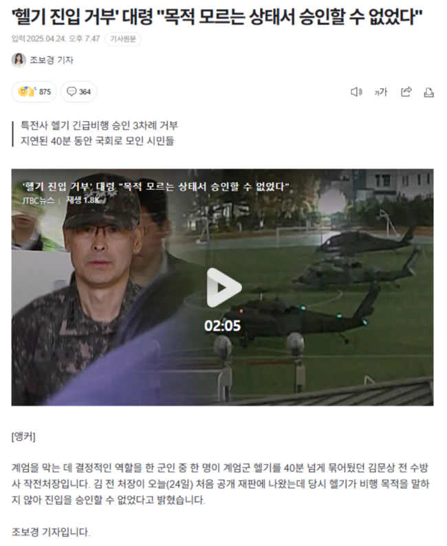 "목적이 불분명한 상태에서 헬기가 서울 공역에 들어오면 안 된다"는 생각이었다며 "목적을 모르는 상태에서 승인해 줄 수 없어 합참, 육본 문의 등 모든 방법을 다 쓴 것"이라고도 했습니다.