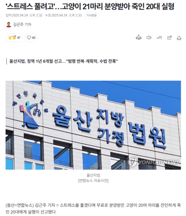 '스트레스 풀려고'.. 고양이 21마리 분양받아 죽인 20대 실형