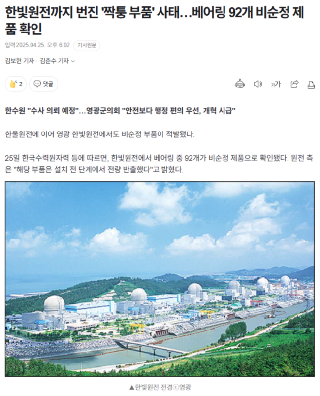 한빛원전까지 번진 '짝퉁 부품' 사태.. 베어링 92개 비순정 제품 확인
