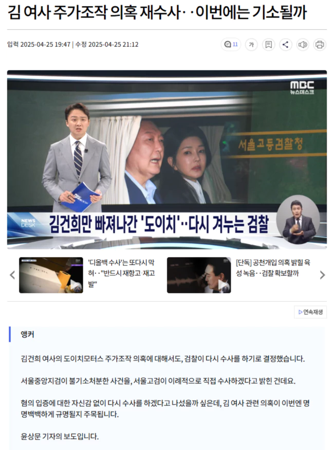 서울고검이 김건희 여사 도이치모터스 주가조작 의혹을 재수사하기로 했습니다.