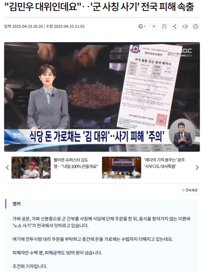 김 대위가 소개해 준 업체는 전투식량 사진을 보내왔지만, 전투식량 값으로 960만 원을 보내자 연락이 끊겼습니다.