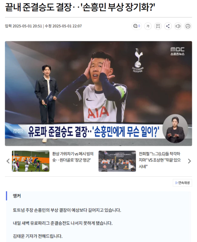현지 매체는 "손흥민이 다음 주 유로파리그 2차전에 복귀할 수 있을지 의심스럽다"며 부상 장기화를 우려했습니다.