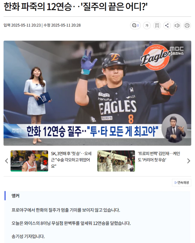 한화 12연승 질주.. "투·타 모든게 최고야"