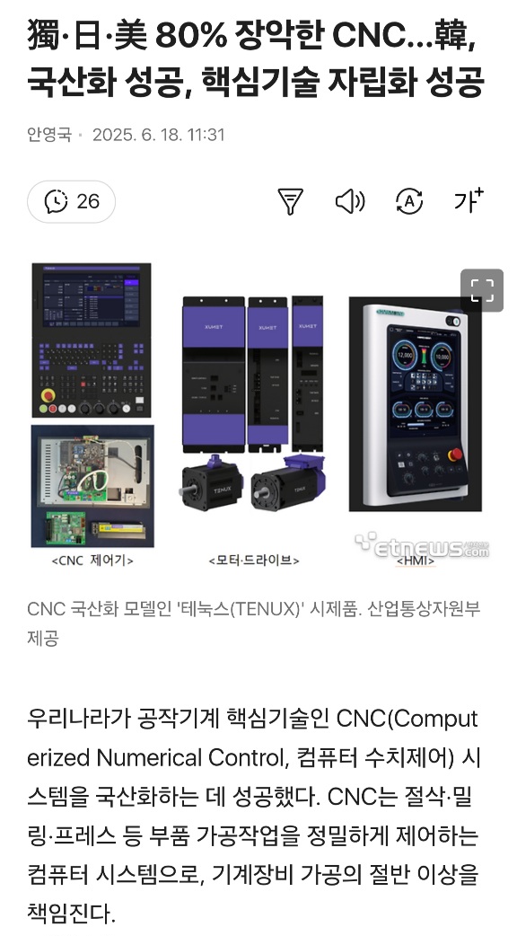 獨·日·美 80% 장악한 CNC.. 韓, 국산화 성공, 핵심기술 자립화 성공