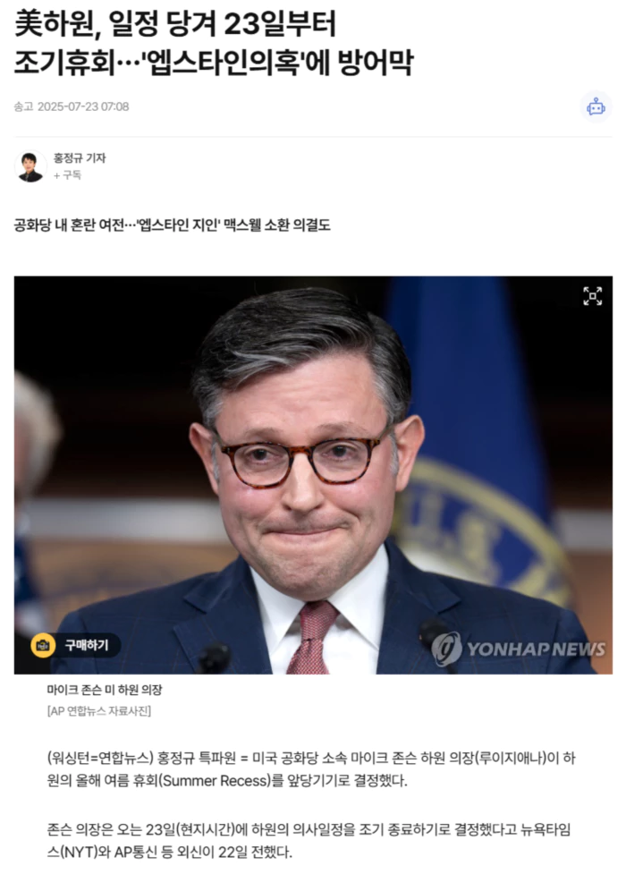 미 하원 규칙위원회 소속 민주당 의원들이 법무부의 엡스타인 관련 문건 공개를 촉구하는 안건을 잇달아 내놓을 태세를 보이자 존슨 의장이 이들 안건의 표결에 제동을 걸기 위해 이같이 결정했다는 것이다.