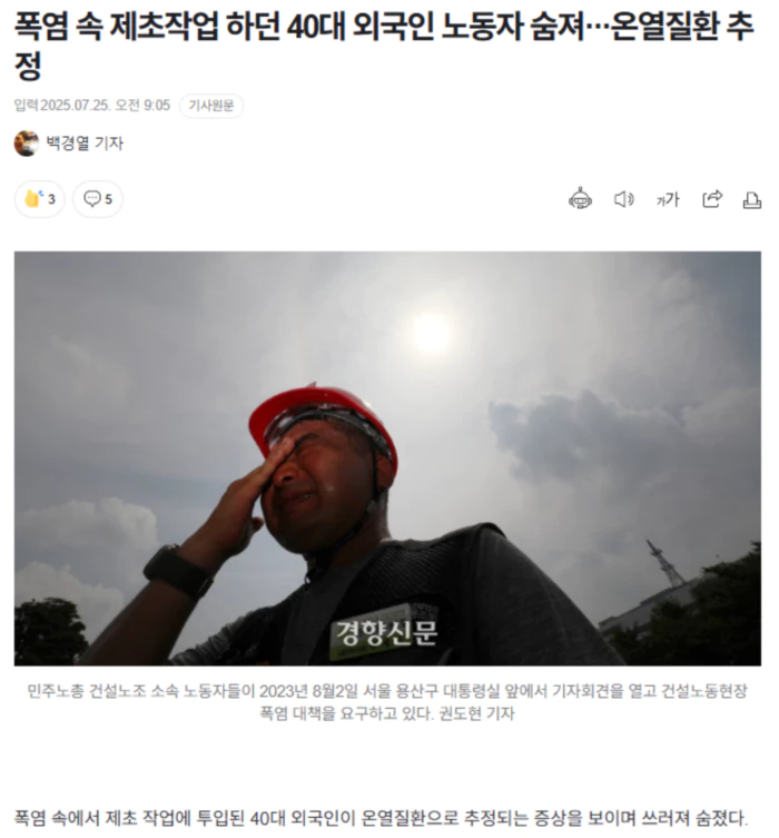 폭염 속 제초작업 하던 40대 외국인 노동자 숨져.. 온열질환 추정
