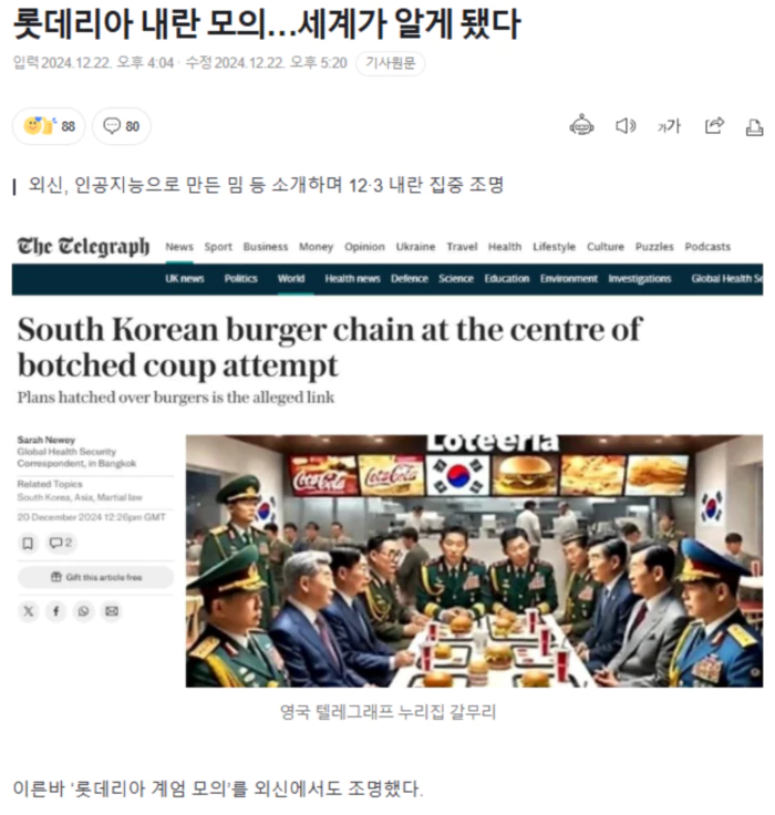 영국 일간 텔레그래프는 20일(현지시각) ‘한국의 햄버거 체인점이 실패한 쿠데타 시도의 중심에 섰다’는 제목의 기사에서 “서울 남쪽의 한 패스트푸드 매장에 ‘계엄 성지’라는 별명이 붙었다”고 전했다.